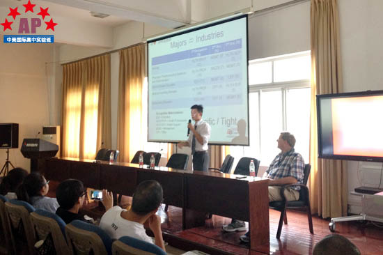 首先, Mr. Allen先生为在座学生讲解了全球多本权威杂志对美国大学进行排名时的不同评定标准。Mr. Allen强调,"除了固有的排名论外,不同的方面去选择大学及职业在美国是很普遍的现象。"虽然各媒体对大学排名的看法各不相同,但个人对大学选择的原因是多元化的,归根结底是符合你学术目标的。"美国大学鼓励学生选修多种专业,但同时,专业不是工作种类高低的决定性因素,全球500强CEO中大学学习艺术也不占少数。"Matt如是说道。