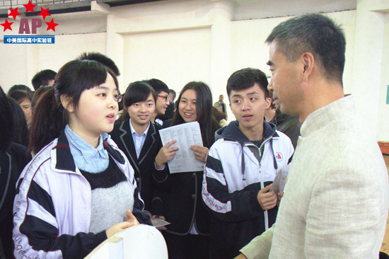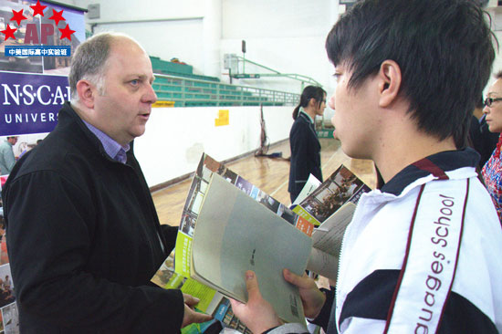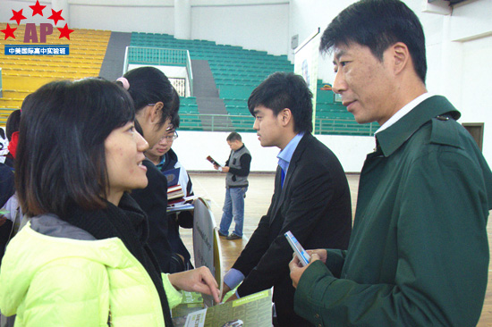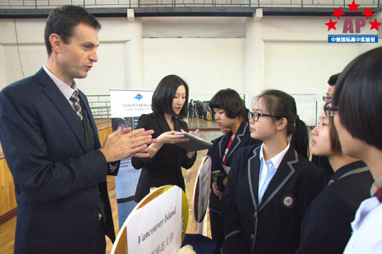 开场致辞后,AP课程中心孩子们与招生官们进行了面对面的交流与沟通,27校的招生官们也对中美实验班学子将来的海外大学申请给予了中肯的建议。其中,滑铁卢大学、国王学院大学、约克大学等高校因其强大的科研水平与优势专业吸引了大批学生前来咨询。国王学院大学招生官告诉同学们,加拿大众多大学比较看重同学们的在校成绩,因为这代表的是同学们的学习与科研能力,所以同学们在准备雅思、托福语言成绩需要同时兼顾好高中阶段的学习。另外,AP课程的学习不仅能够兑换学分,也能为留学节约一笔开支。