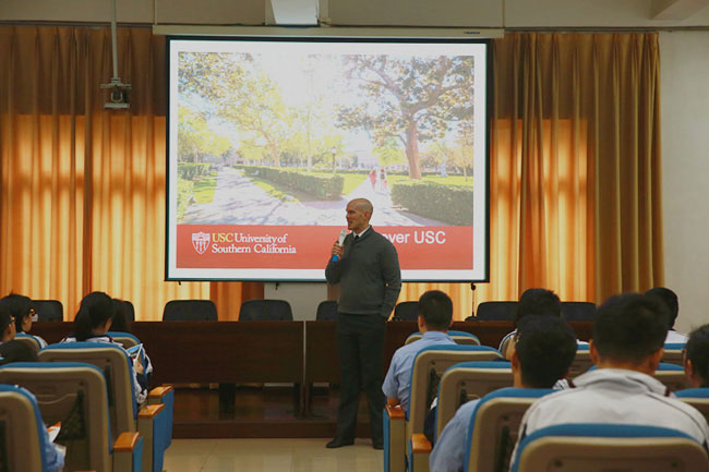 南加州大学应该是众多家长和学生都知晓的美国著名高等学府,位于美国加利福利亚洛杉矶市,1880年创立,是美国西海岸最古老的私立研究型大学。它的专业覆盖面、地理气候、交通状况、校园风光等基本信息网络一搜就能知道,去年成外AP就有两位同学去到这所大学就读。今天来访,招生官到场就直奔主题,从Discover USC(发现南加大)、USC Overview(南加大概览)、Deadlines for Undergraduate Applicants(本科申请最后期限)几个方面进行了讲述。