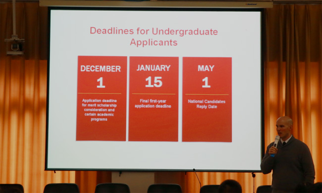 关于“本科申请最后期限”,招生官介绍了,今年12月1日是奖学金和某些学术项目学生申请的截止日期,明年1月15日是本科一年级申请的最后截止日期,明年5月1日是录取回复截止日期。(下图↓)