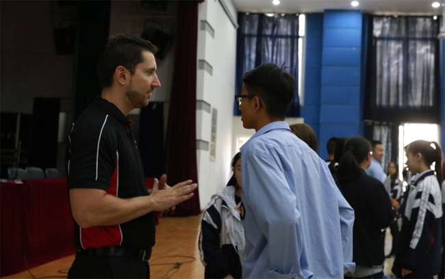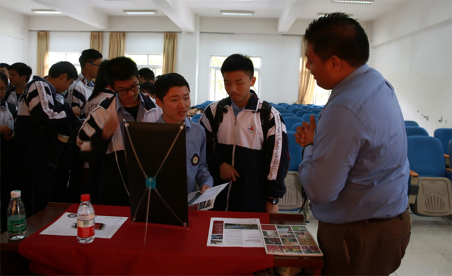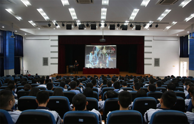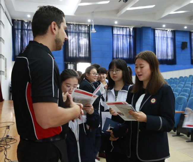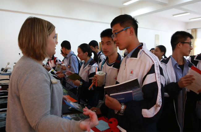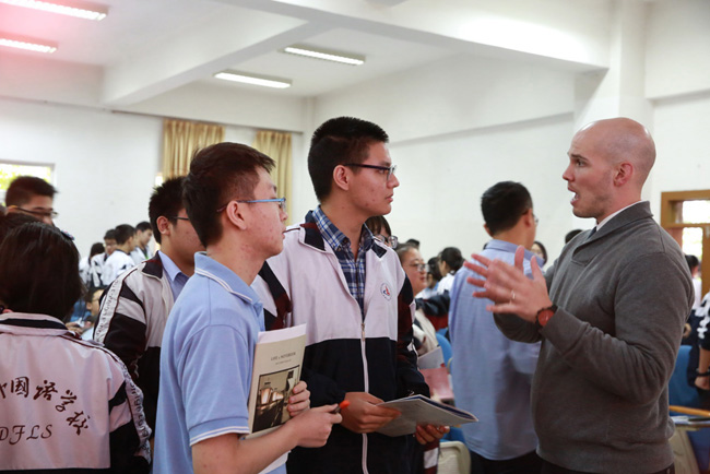介绍完后,招生官也给同学们留出了提问时间,在场的高二、高三均有同学举手提问。同学们关心的申请成绩,包括GPA,SAT和托福,招生官还是提醒同学们要注重平时的学习,不要只为分数,要关注自己学习的兴趣和真正的热情所在。提问时间结束后,同学们还是习惯性围住招生官问问题,交流,下图为证↓