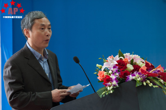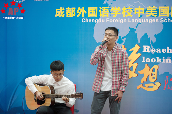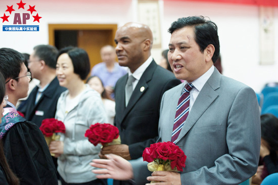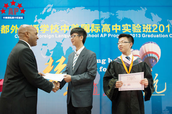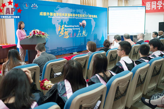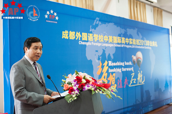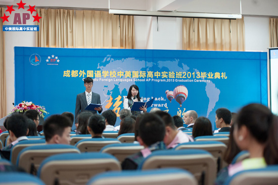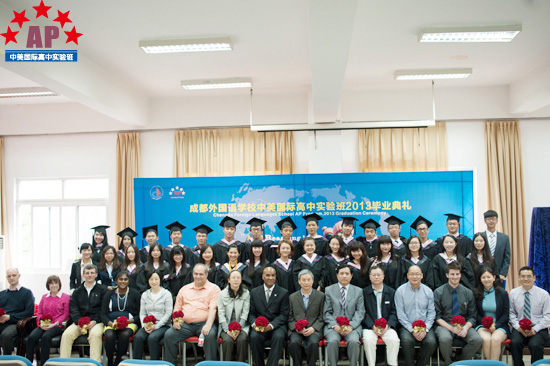 5月17日上午9点,成都外国语学校行政楼三楼礼堂内华灯璀璨,鲜花锦簇,一片欢声笑语,AP课程中心实验班的2013届毕业生典礼在这里隆重举行。校长段必聪,副校长路跃、龚智发、黄伟,校长助理郑军,国际部主任王维荣等学校领导出席了毕业典礼,AP课程中心实验班学术校长Mark Robertson、中外方教职人员以及2013届52名毕业生参加了毕业典礼。
