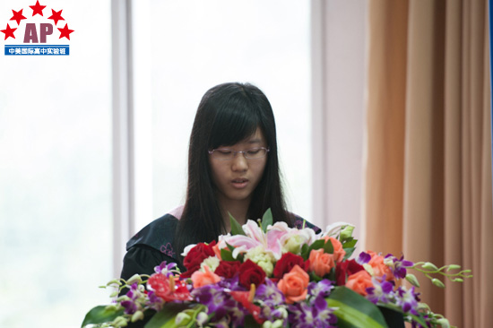 毕业生代表林怡欣回顾了三年的AP课程中心生活,收获的知识与友情,由衷地感谢学校的精心培育和老师的关心与帮助。林怡欣说:"感谢我们的母校,感谢和我们一起走过三年的老师们。是你们给予我们自信,是你们给予我们希望,是你们见证我们成长。"最后,她代表AP课程中心实验班2013届全体毕业生2013届全体高三国际部毕业郑重承诺:今天我以成外为荣,明天成外以我为傲。