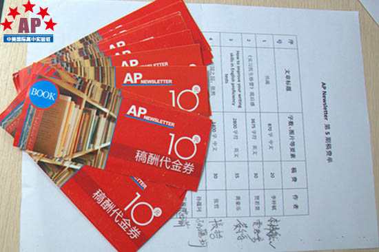 点评完第5期《AP Newsletter》,编辑部老师为本期选登上《AP Newsletter》的优秀文章的作者颁发了稿费。有的学生记者将自己努力挣得的稿费拿去买了托福、SAT等语言学习的书籍,有的学生记者拿稿费购买了AP经济学等学科书籍,每个学生记者将自己人生的"第一桶金"用在了学习上。