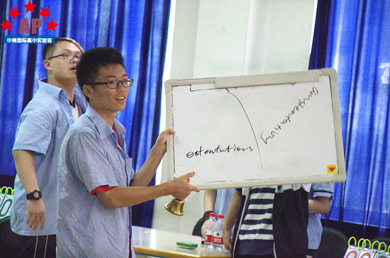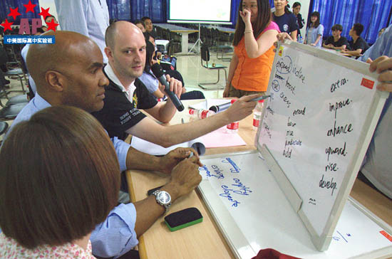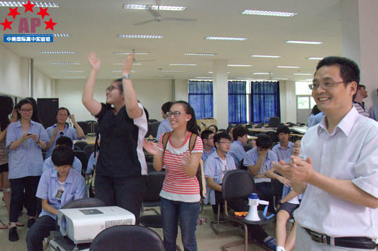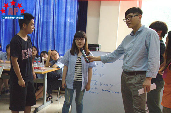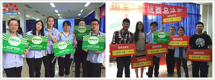 6月17日下午3点,AP课程中心实验班首届"我是单词王,我为单词狂"挑战赛决赛在校图书馆二楼火爆开赛。6支月度比赛获胜队伍同场竞技,一较高下;学术校长Mark Robertson、外教Katy Tegeler和Tim Johnson老师担纲专家评委,同学、家长亲友团场下呐喊助威各显神通。经过3个小时的激烈竞争,"阿弥陀佛"队以总分第一的成绩获得总决赛冠军团队,曾维进同学摘得个人"单词王"桂冠。