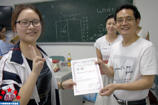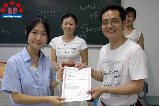 国际部主任王维荣为年度优秀学生记者张蒂丝颁发荣誉证书和奖品