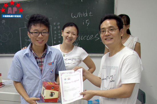国际部主任王维荣为年度优秀学生记者张哲颁发荣誉证书和奖品