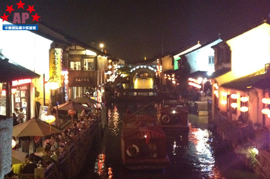 刚到苏州的时候,我就被深深地吸引了。然而最先抓住我眼球的并不是精致的亭台楼阁和假山湖泊,而是远近闻名的苏州小吃。听说七里山塘是一条满溢着苏州特色的类似锦里的街,小吃、茶馆、工艺品等比比皆是。于是为了一饱口福,趁着美丽的夜色,我们来到这条名副其实的特色街。映入眼帘的首先是一座小桥,桥下是一条横穿的小河,后面就是张灯结彩的七里山塘了。