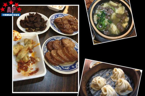 作为一个吃货的目的就是走到哪儿吃到哪儿,吃始终排在第一位。于是为了刺激味觉,我们来到了复古装饰的五芳斋,和成都的龙抄手钟水饺等小吃店类似。踏着吱嘎作响的木梯上楼,坐在木头长条板凳上,大家围坐在矮小的木桌四周,的确是别有情趣。最幸福的还是热腾腾的小吃端上桌贪婪地闻着浓郁的食物香气的时候。桂花鸡头米是最香的,空气里弥漫着的桂花香味足以让一个减肥意志超级坚定的人动摇。鸡头米是黄色的很有弹性的小丸子似的东西,很劲道,但嚼起来毫不费力,随着甜甜的桂花汤一起下咽,一个字爽!糖藕也是特色之一,藕是切片的,孔里包有粘粘的糯米,外面裹上一层蜂蜜,一口咬下去藕的口感正好,不至于入口即化,也不至于脆到需要费力咀嚼,甜而不腻才是巧妙之处。小笼包,甜豆腐干,臭豆腐的味道也不相上下。当然,说到臭豆腐,我不得不承认这真的是吃起来最带感的美食了,会吃的人肯定会异口同声的说,臭豆腐太香了!外酥里嫩,配上浇在豆腐上的辣辣的酱汁,味道正宗得让人欲罢不能,不过吃完之后全身上下都会散发着臭豆腐诱人的香味,走在街上也会有人敬而远之,然后自己在旁边偷笑,回味着臭豆腐给人带来的满足感。