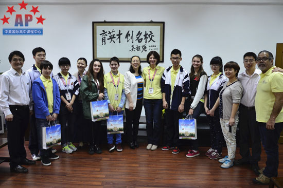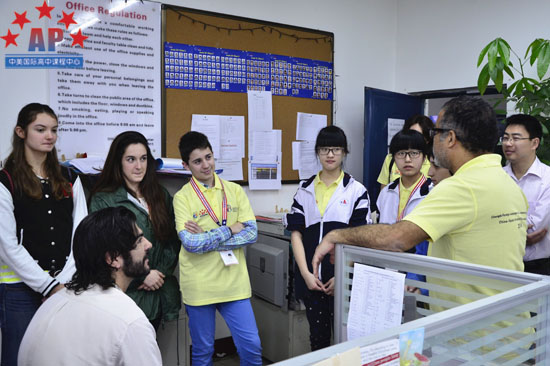 早上8点,本次交换项目的四位西班牙学生与四位中美高中的学生一起来到了学术校长Mr. Roberto Santos的办公室。一见面,细心周到的校长Mr. Santos就询问四位交换生是否已习惯了成都的生活。而得知这群精灵的“小鬼”已在寄宿家庭的带领下观看了电影、K了歌、还品尝了成都地道美食,Mr. Santos就露出了满意欣慰的微笑。短暂寒喧后,Mr. Santos还带着大家参观了教师办公室、图书室、升学办公室、走廊展板……通过学术校长的耐心介绍,四位西班牙学生对AP课程中心的日常学习与生活有了清晰的认识。值得一提的是,每每经过走廊展板时,Mr. Santos都忍不住自豪地向四位交换生展示AP课程中心历届学生所取得的成就。西北大学、加州大学伯克利分校、全国中学生英语学术辩论赛(四川赛区)亚军、赛达2310……学术校长Mr. Santos对学生的每一次进步与取得的成绩都如数家珍!