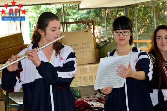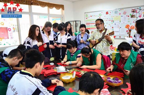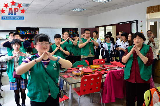 接着,学术校长Mr. Santos带着AP课程中心乐队为阳光家园的师生们奉献了一场精彩的演出。自由明快的吉他声伴着孩子们清亮的歌声,西班牙交换生和数位AP课程中心学生将祝福融成了旋律。"假如幸福你就拍拍手,假如幸福你就拍拍肩"……阳光家园的学员们也加入了我们,与我们一起唱歌跳舞。西班牙交换生Sara还带来了长笛演奏,在场所有人都屏住呼吸静静聆听着管弦乐的悠扬。两个小时的相处,AP课程中心师生还与学员们一起做早操、剪纸、画脸谱……西班牙American School of Bilbao的Allison老师还买了数件阳光家园学员们的手工制品。"我要让西班牙的学生和家长看到阳光家园学员的天赋与认真,我还会将今天买得的作品拍卖出去,所得的善款会全部捐给需要帮助的人。"Allison老师如是说。