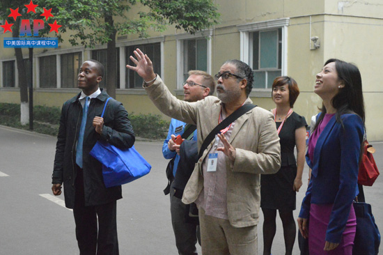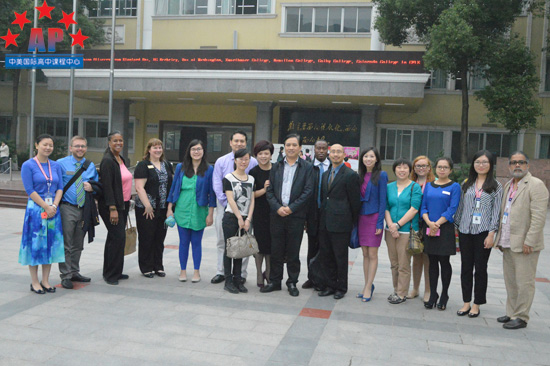 经过一晚的休整,第二天早上8点30分,访问团准时到达本次系列访问的第一站--成都外国语学校。AP课程中心学术校长Roberto Santos带领课程中心全体老师在校门口迎接访问团的到来,并引领招生官们参观学校校园环境。在参观过程中,Mr. Santos以及AP课程中心曹老师为招生官们详细地介绍学校的建校历史、设施建设以及其他基本情况。当看到极具中国特色的亭阁、小桥、微观园林等,招生官们都纷纷表示这是一所环境优美、设施齐全的学校,并对学校表现出极大的兴趣。