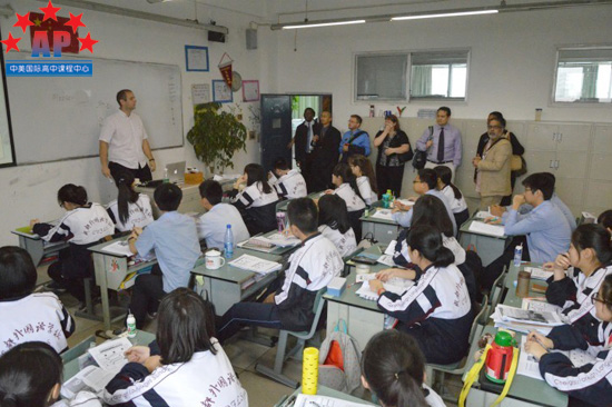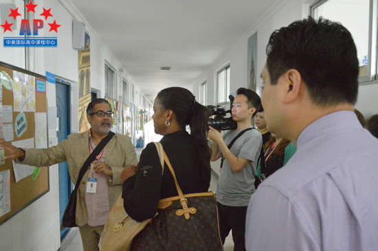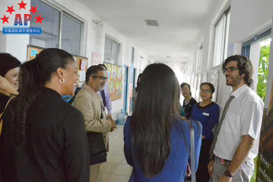 接下来,招生官们前往AP课程中心进行参观。早在几个月前,AP课程中心的同学们就已经知道了美国7大名校将要到访的消息,经过几个月的期盼,终于可以与这些美国顶尖大学的招生官进行近距离接触,这让同学们都兴奋不已,并对于招生官们的到来表示了热烈欢迎。在这里,招生官们了解了同学们在这里上课的情况,并参观了外籍教师办公室、课程中西图书馆、海外招生办公室等,并就课程开办情况、课程设置、教学管理、升学指导等方面进行了沟通。经过这一系列的参观,招生官们对AP课程中心有了更加深入的了解。