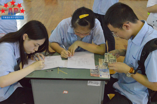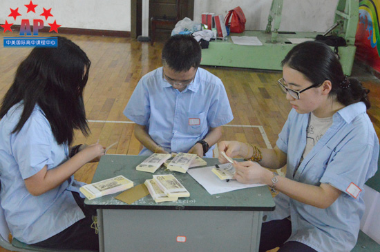 除此之外,针对AP课程中心学生的特点,中行的老师们还另外准备了两个游戏--"打造金手指"和"外币兑换"。一个要求同学们在指定时间内,点清十把练功券;另一个要求同学们对给出的外币进行辨识,并依照汇率折算成人民币。这两个游戏让同学们认识了很多的外币,并了解了他们与人民币之间的汇率,为他们了解更多的外币及兑换知识打下了基础。