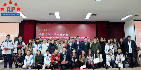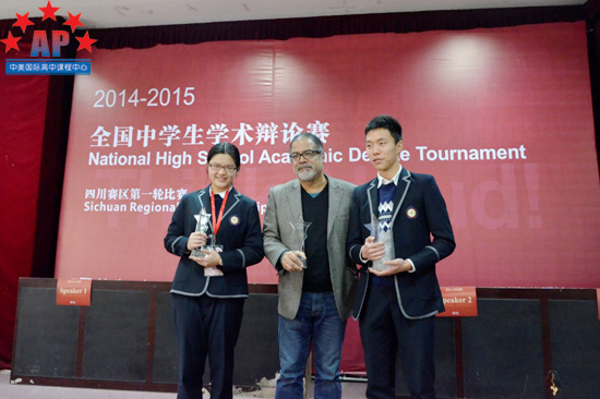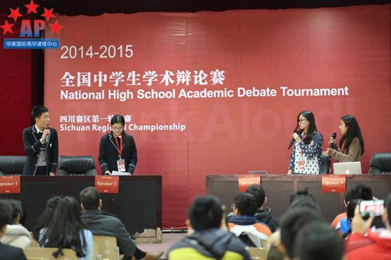12月13日至14日,2014-2015全国中学生学术辩论联赛(四川赛区)第一轮比赛在成都实验外国语学校成功举行。成都外国语学校AP课程中心的谭嘉欣、李秋硕同学凭借成熟稳重的台风及犀利的观点一路过关斩将,最终获得了本次比赛的亚军。来自北京人大附中的杨璐璐荣获"最佳辩手"称号。据悉,本轮参赛选手除了来自成都多所重点中学,如成外、石室中学、树德中学,还有来自宁波、深圳、南京、西安、北京的学生,共计180位,参赛人数为四川赛区开赛以来最多,比去年增加了近一倍。谭嘉欣、李秋硕两位同学的脱颖而出实属不易。