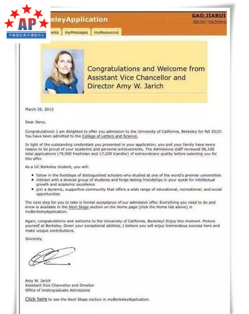 继上周高嘉瑞同学获得加州洛杉矶大学录取后,她再次斩获了加州伯克利的录取!