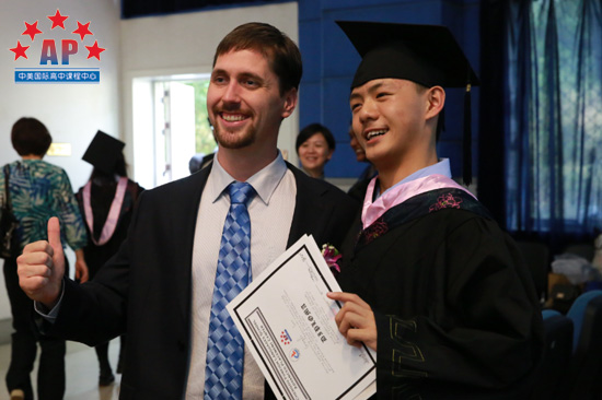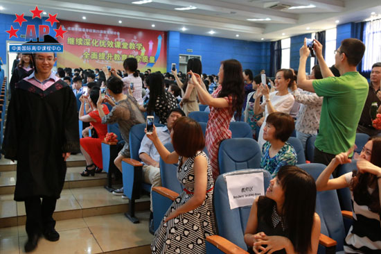 人气爆棚的毕业生郑宇森"森哥"是2015届的传奇,他言行自成风格,成为同学模仿的对象,是AP课程中心名副其实的"明星"。他精通电脑编程,成绩名列前茅,被誉为AP课程中心爱因斯坦,就是这样一位不苟言笑怪才,今天站在了属于他自己的舞台,代表毕业生发言。"森哥"全程英文演讲,虽然声音因紧张有些颤抖,但他还是完美完成了自己的发言。他告诉在座的各位:"不要欺骗自己,欺骗自己的人无法分辨真伪,然后玩世不恭,因为玩世不恭,最后会失去爱的能力。"场下响起雷鸣般的掌声。