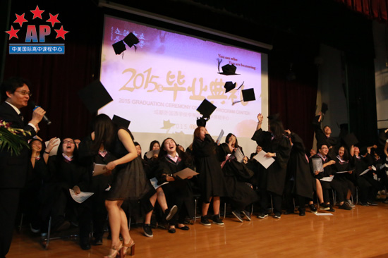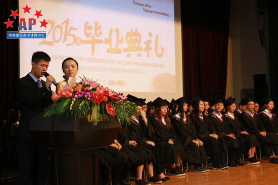 上午九时许,成都外国语学校AP课程中心汪老师宣布:"2015届毕业典礼正式开始",随即毕业典礼正式拉开帷幕。踏着激昂的音乐,毕业生着统一学士服由班主任带领进入会场,在场观礼的家长和学弟学妹们纷纷拿出手机,记录下这珍贵的时刻!毕业典礼由应届毕业生田书韵Sunny,张航铭Rhythm主持,中英双语的主持稿,尽显AP课程中心"国际范儿"。