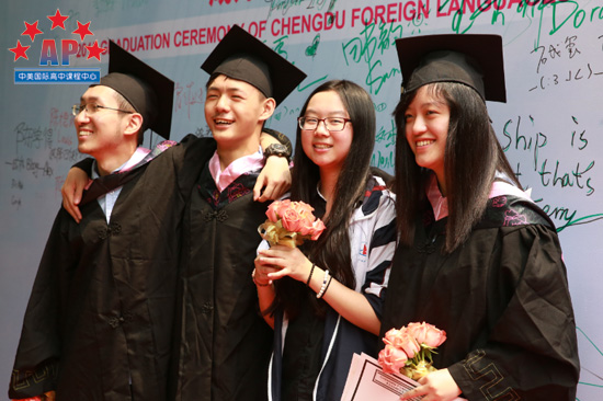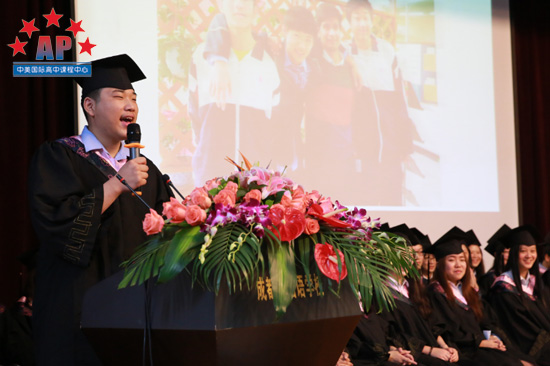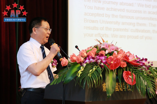 成都外国语学校龚智发校长发表致辞,首先,他对课程中心的工作表示肯定,因为有了所有老师的辛勤付出加之学生的努力,才会有布朗大学﹑加州大学伯克利分校﹑加州大学洛杉矶分校的录取。同时,龚校长还对课程中心毕业生寄予厚望,他讲道:"毕业生即将开始人生新的旅程,在新的道路上一定会充满艰辛和意想不到的困难,但我相信你们一定会克服这些困难,因为你们是AP课程中心的学生!回想三年前,你们还带着稚嫩和青涩进入课程中心,三年中,你们不仅在学业上取得了成就,还在能力上获得了提高。我为你们感到骄傲!在去美国之前,我给大家三点建议:1.好好学习中国文化,将中国带向世界,做文化的传播者,这是你们的义务。2.在大学,学"大学",大学不是一座建筑,大学本身就是文化的象征,饱含多元化的知识。3.用辩证的思维,不同的角度看世界,你会更快的成长。"龚校长的讲话意味深长,相信毕业生们都从中受益匪浅。