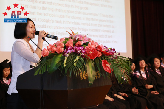 如果说龚校长的致辞是"饱含诗书",那家长代表袁女士的致辞可以称得上"真情流露",袁女士在致辞中不止一次的强调到孩子Google在课程中心三年以来一点一滴的变化,从胆小羞涩到敢于在众人前发表自己的意见;从"掉队生"到佼佼者;从"自卑"到自信,一路走来,作为家长真心的感谢课程中心。袁女士几度哽咽,打动了在场的同学和家长。孩子成长离不开老师的谆谆教诲,更离不开家长的支持。