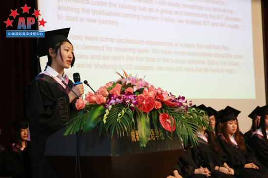 作为ED成功,拿到常青藤名校布朗大学录取的范雨萌,代表毕业生发言。范雨萌以幽默的开场白打破了本是一场伤感的离别,范雨萌回忆:"至今仍清楚的记得我们在一起学托福,一起没日没夜学SAT的日子;仍然讨厌班主任叫我们做清洁,王主任没收电子产品,在校门口"抓"外卖,虽说"讨厌",但我们清楚的明白老师是为我们好。"今天,我们就要毕业了,过去三年我会牢牢记住,高中三年是我一笔宝贵的财富,我认识了所有的小伙伴。我们对未来充满了期待,在美国,我还是会和我的小伙伴们保持联系,一起"夜谈会",一起谈笑风生。青春散场,时光不散。