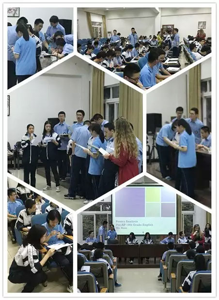 AP课程中心的英语老师Miss Rose,她给同学们带来了不一样的诗歌欣赏: The Road Not Taken(1916,RobertFrost) . 一百年前的诗,同学们应以怎样的心境去理解这首诗,如何将一百年前的诗人的选择和自己本身实际联系起来呢?为了帮助初三的同学们更好地了解AP英语上课模式,Kali 老师派出志愿者去寻找学习小伙伴一起学习这首诗。从最初被邀请时的害羞和不情愿,到在一起经过10分钟的学习讨论,这些学弟学妹们也能自如大方地分享三个从易到难的问题。Kali老师说,没有对或错,有很棒的想法,有认真思考就是棒棒的!