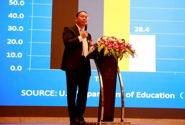 讲座共分两个议题,分两个板块,两种方式进行。议题一是国际课程的挑战与选择,狄邦教育管理集团总裁张博文先生做了长达1个小时的分享,他分别从升学与辍学、美国名校的学术挑战、如何培养学术能力、如何选择国际课程这四个方面进行了分享。以最新的新闻,专业的数据分析,真实的国际课程要求,以及美国名校申请指南为例为在座的家长学子深入浅出地讲解了当今中国国际课程存在的挑战和拥有的机遇。