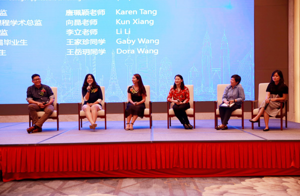 随后,讲座以访谈的形式进行了议题二的讨论。“如何应对海外大学的学术挑战”这是很多准备出国留学甚至已经在留学的中国学子都需要面对却不知如何面对的问题。狄邦教育市场部常务总监马莅骊以主持人的身份现场访谈了由狄邦教育升学项目总监唐佩颖老师、成都英锐学校校长向昆老师、狄邦教育考培产品总监李立老师、石室剑桥国际高中2014届毕业生王家珍同学以及成外AP课程中心2015届毕业生王岳玥同学组成的“智囊团”。访谈主要探讨了中国学生的能力短板——海外求学会遇到哪些挑战,高中三年如何规划使得优秀学生成为优秀的申请人,新SAT给我们带来哪些启示并且该如何应对等问题。