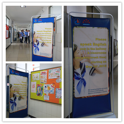 小编在过道上来回走了几趟,都是英文,因为一个几十米长的过道上摆了三个标识,提醒→“从此只能说英语” ↓↓↓