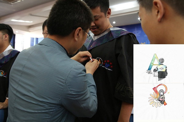 老师为学生们别上,AP学生亲手设计的AP徽章,以此纪念