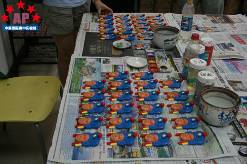 一路参观完毕后,同学们来到三楼智障学员们的手工教室。令所有人叹为观止的是桌上陈列的大大小小的工艺品,就像批量生产的瓷器一样,每一个木质娃娃都栩栩如生。后来大家才知道这些木头娃娃都是残疾朋友用颜料亲手上色的。看着均匀的色彩和细致的颜色划分,我们都不得不感叹他们的心灵手巧。另一个房间里还有朋友为我们现场展示了手工编织艺术品的过程,大家都目不转睛地看着,目瞪口呆。