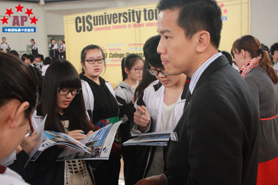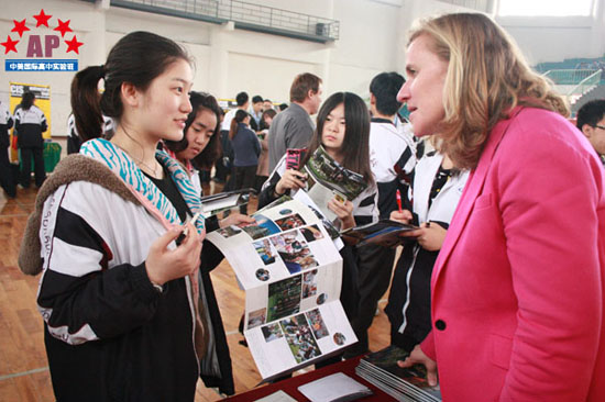 交流会上,19位名校招生官对中美实验班学子将来的海外大学申请给予了中肯的建议。普及湾大学的招生官告诉同学们,在录取国际学生时,美国大学更看重学生对自己的认知能力。同学们并不需要和同龄人比较,而是要不断地发现自己的特长与优势。所以,尽管同学们在申请大学时就已选了专业,但仍有机会申请调换专业。而英国利兹都会大学招生官Susan告诉中美实验班同学,英国绝大多数大学会提供一年的专业实习机会,同学们在校期间就可以进入到世界五百强的企业,这样就更能帮助在校学生毕业后找到理想的工作。