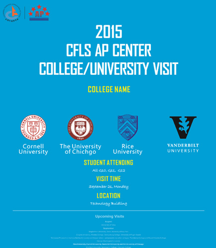 Since AP Center was founded in 2009, there have been more than one hundred American, Canadian, European universities that have visited Chengdu Foreign Languages School AP Center. Our students have shown through good English communication skills and positive attitude the dedication of AP Center students. They have asked different kinds of meaningful questions during the college visit events, leaving admission officers very good impressions of our students. Based on our students’ successful performance, more and more famous overseas universities have contacted our college counselors to express their willingness to visit our center.