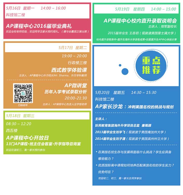 本届AP课程活动周将开设毕业典礼观礼、课程开放日、课堂试听、家长沙龙等一些系列活动,我们诚挚邀请对国际课程感兴趣 的初一、初二、初三及高一家长参加。另外,我中心将于5月22日9点举行2016年最后一次统一入学考试,请家长们在线报名。