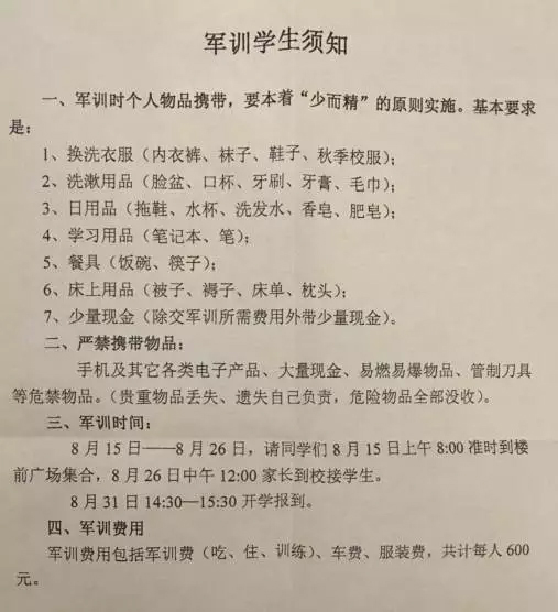 军训费用包括吃、住、训练、车费、服装费,每人共计600元。